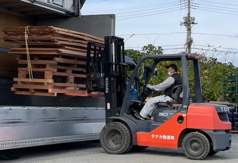 フォークリフトによる積み込み作業。フォークリフト資格取得の支援制度もあります。